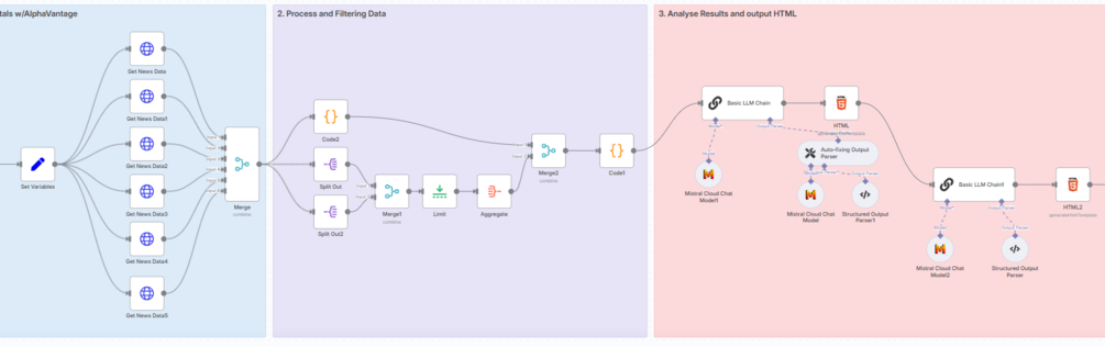 - Dynamic Data Fetching: The “Set Variables” node passes the stock symbol to the API calls, ensuring the analysis is specific to the chosen stock.