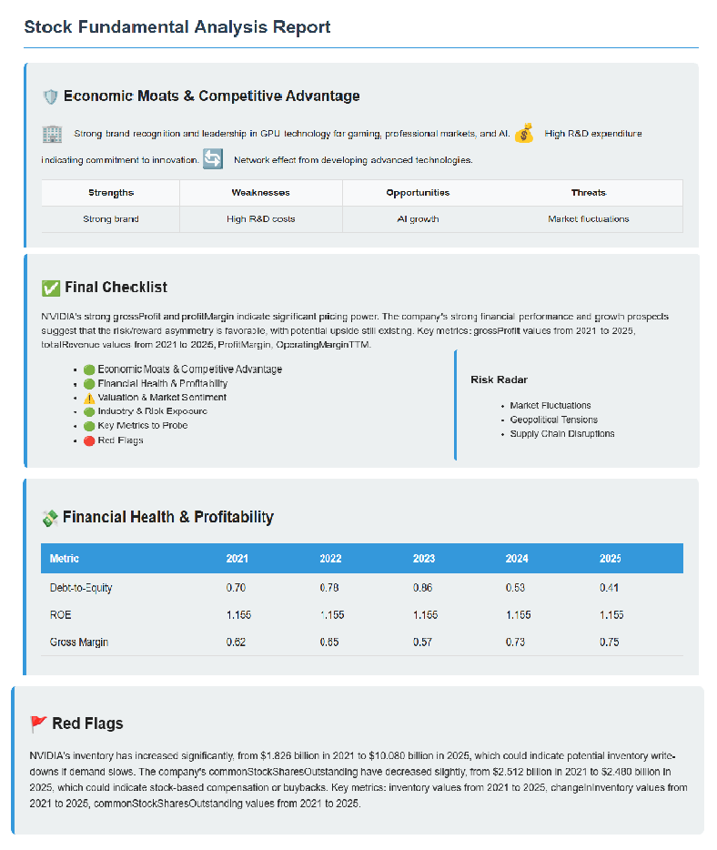 { "Economic Moats & Competitive Advantage": "NVIDIA’s leadership in GPU technology and strong R&D investment...", "Financial Health & Profitability": "ROE of 25% is exceptional, driven by profitability rather than leverage...", ... } - Validation: An “Auto-fixing Output Parser” ensures the output adheres to the expected JSON schema, retrying if necessary.
