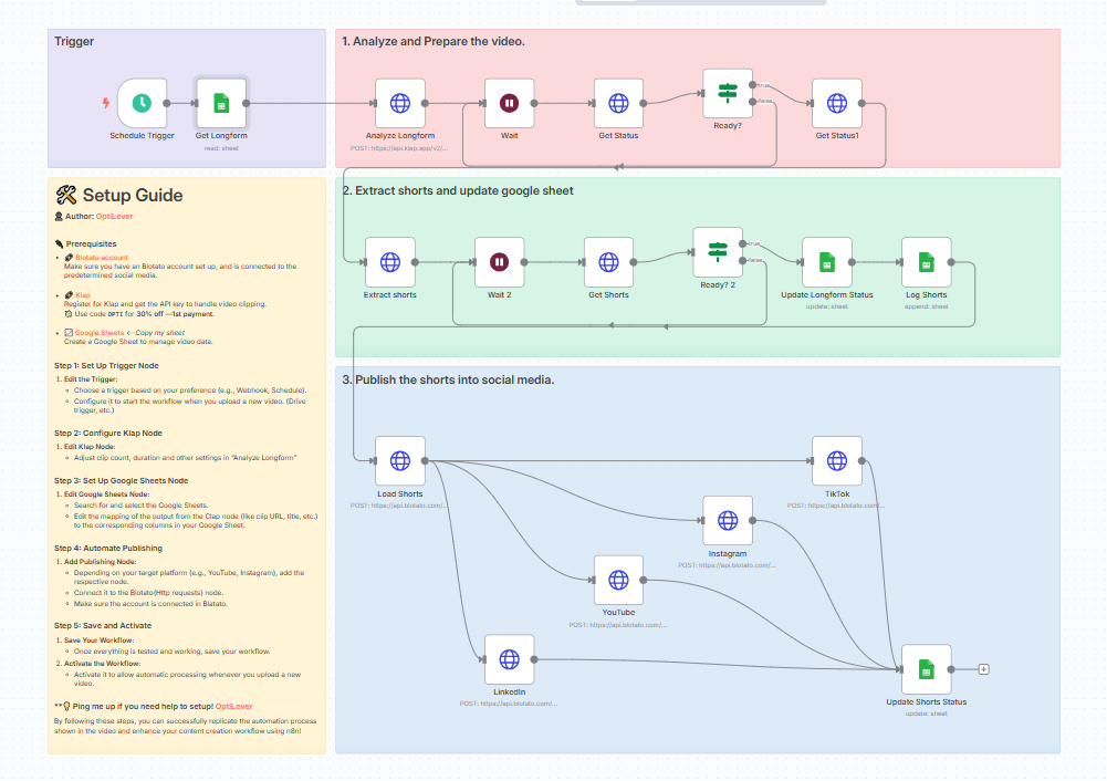 Introducing our AI-powered automation tool that uses n8n and Klap to streamline your content creation process. This no-code solution allows you to automatically clip your long-form videos into multiple short-form videos, complete with context recognition and subtitles, and publish them across various social media platforms.